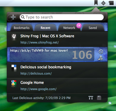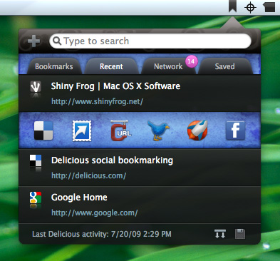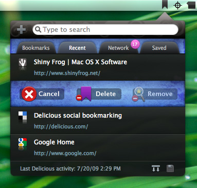 Delibar will show you the bookmarks saved on Delicious by the people that are in your network. A nice growl notification will popup when someone puts a new bookmark on his/her account. Delibar also keeps track of which bookmarks you have already visited, so you can leave a marked website that you want to check out later.